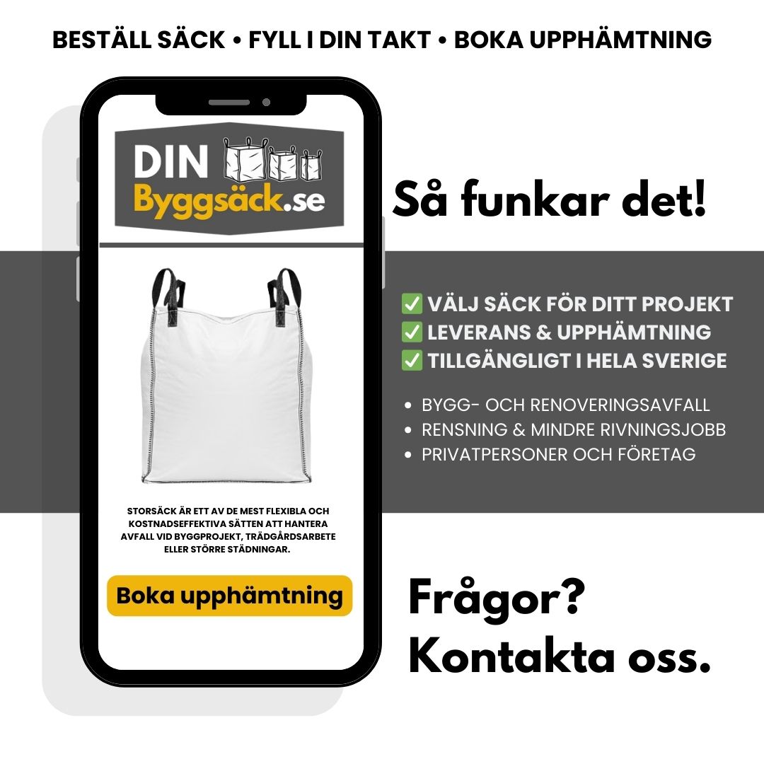 Din Byggsäck gör det enkelt att bli av med avfall vid bygg, renovering eller rensning. Säcken levereras till din adress och hämtas när du är klar – en smidig lösning utan släp, köer eller krångel.
